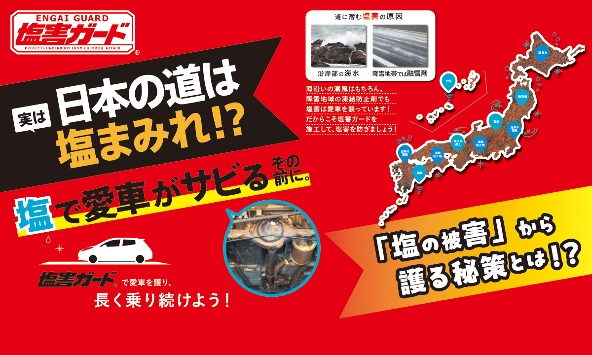 高耐久車体下部防錆塗料「塩害ガード」。日本のトラック物流を支える縁(塩)の下の力持ち「塩害ガード」は降雪地域や沿岸地域の走行が多い物流事業者様から高い支持を頂戴しております。